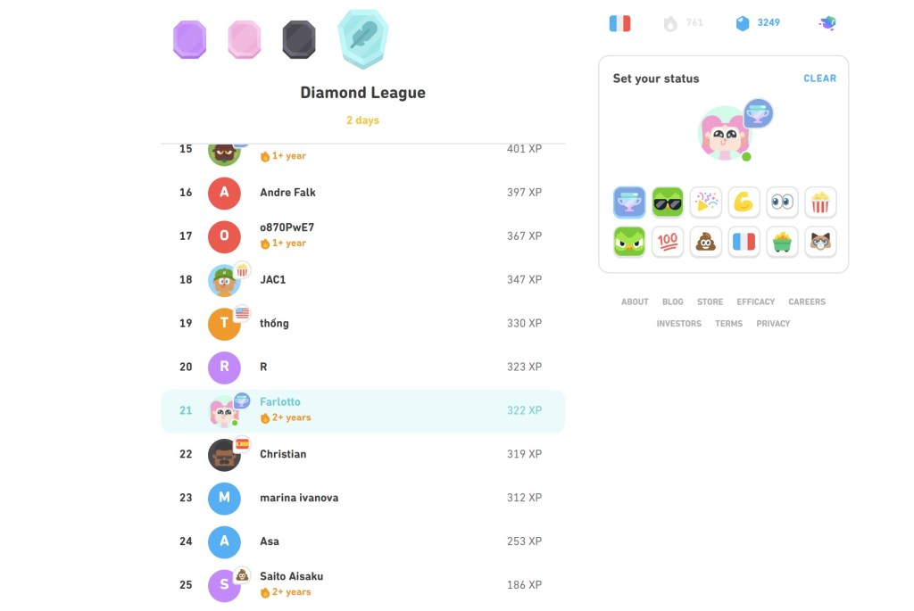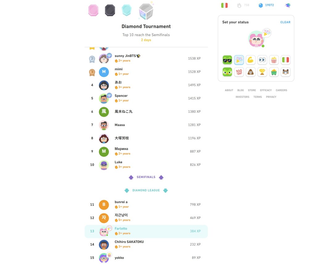 這一年Duolingo加入了Tournament機制,這僅限於Diamond League才會有的挑戰,並不是每個玩家都能出現這競賽,據說只要名次前面,就很容易出現,只要在出現Semifinals訊息時衝到前十名就可以繼續挑戰。連續三週拿到前十名就會有特殊的獎盃圖騰,這個圖騰可以在「Set your status」中替換,跟其他玩家炫耀自己拿到了特殊獎盃。