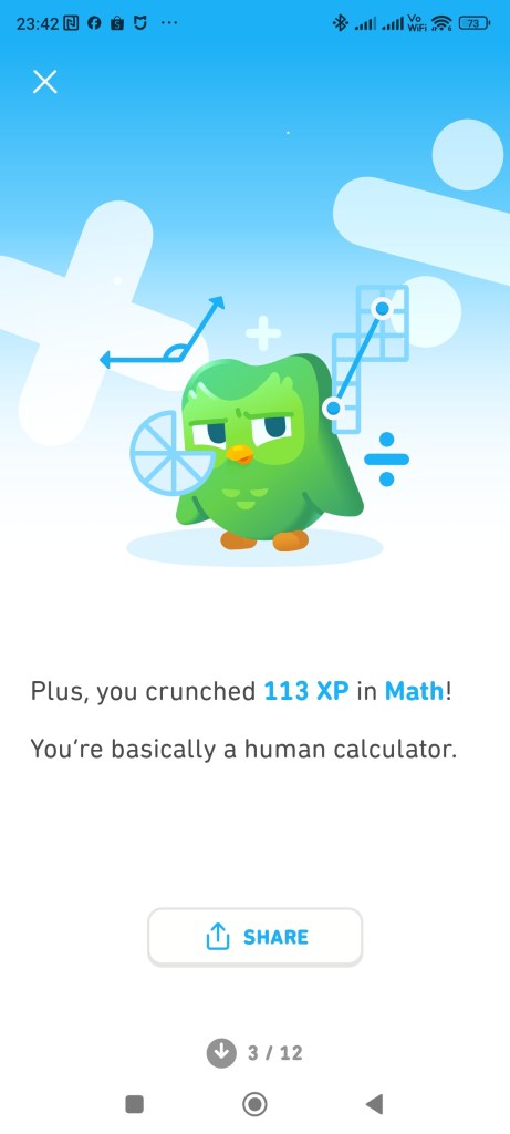 理想上,每天我們會在美語部分學習"兩格"進度,其他語言僅”一格”進度學習,但上小學後因課業關係,每天僅在法語部分做一格續命,避免天數積分(streak)中斷。